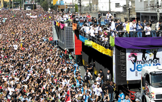 “Pertenezco a Jesús. Soy un campeón”, fue el lema de la marcha que se realizó en Brasil. Muchos llevaban la frase en sus camisetas con los colores de la selección brasileña (amarillo, verde y azul). Seiscientos mil evangélicos según la policía participaron en la “Marcha para Jesús”, este pasado sábado en Rio de Janeiro.