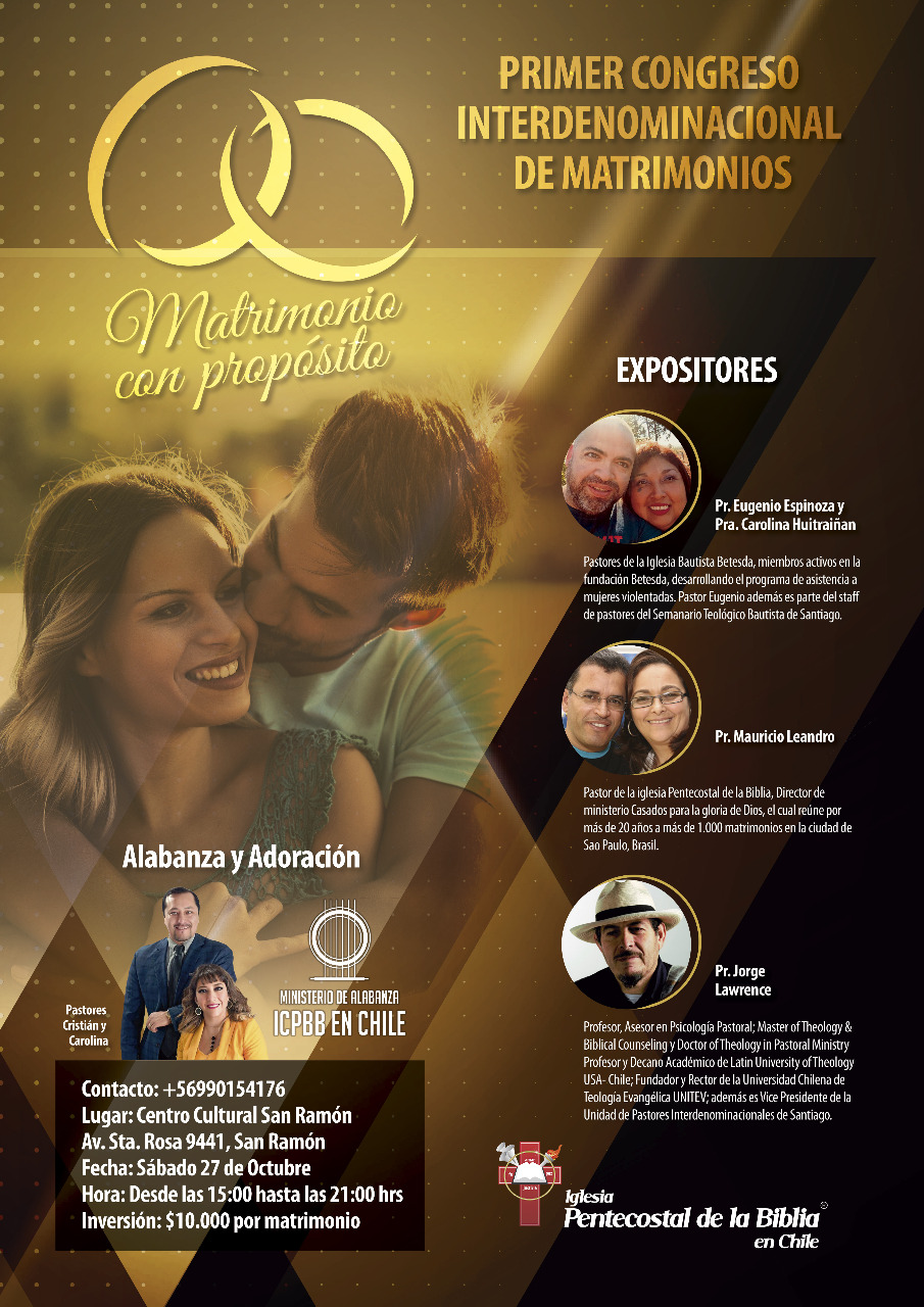 El congreso “Matrimonio con Propósito” se llevará a cabo este sábado 27 de octubre de 15:00 a 21:00 horas en el Centro Cultural San Ramón, ubicado en Santa Rosa 9441, y tiene un costo de 10.000 pesos. Si desea inscribirse o tiene alguna duda, puede contactarse al número  +56990154176.