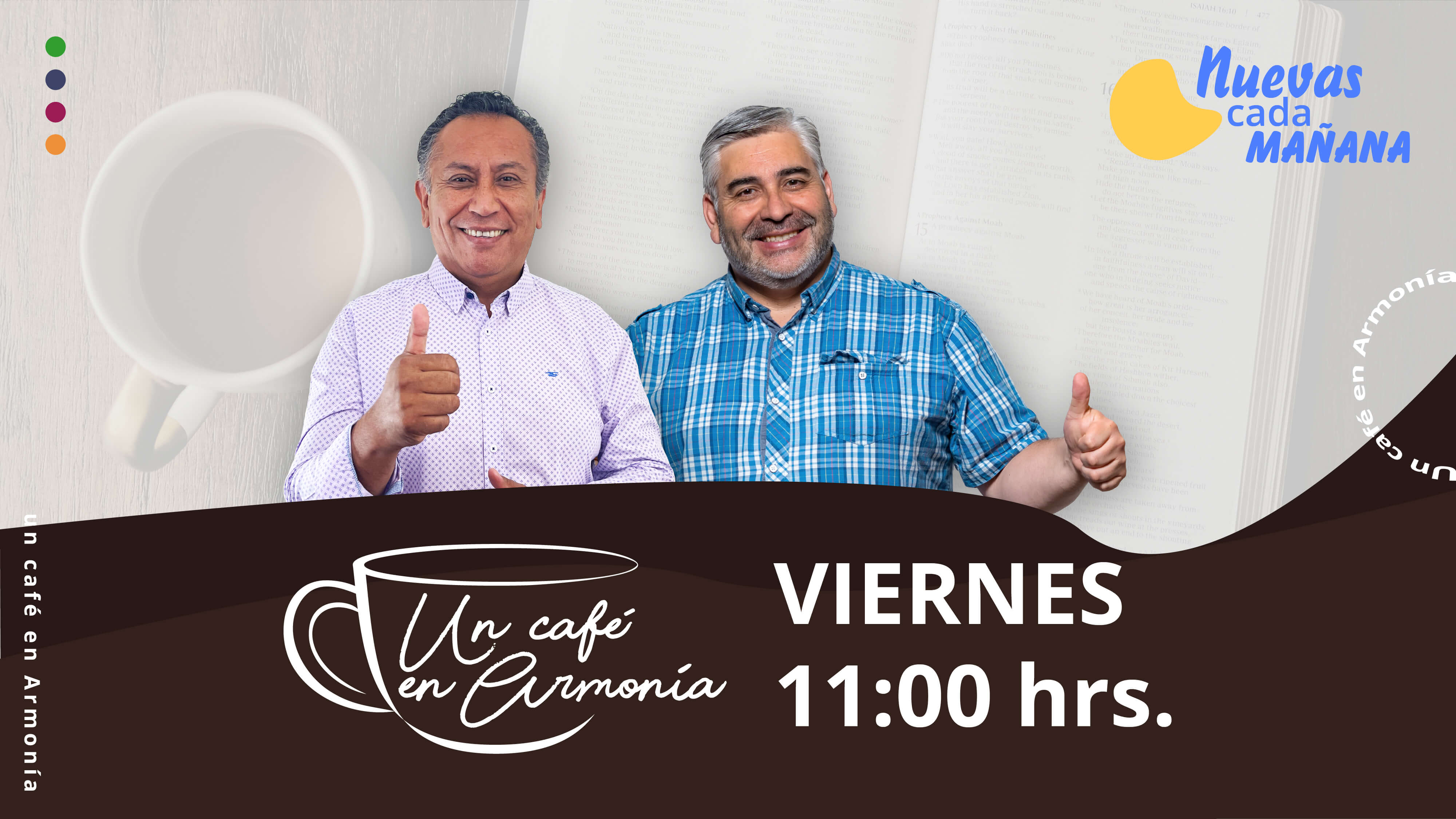 Al llegar el día viernes a partir de las 11 hrs. preparamos nuestra tacita de café para disfrutar un placentero tiempo en Nuevas Cada Mañana junto a los pastores Boris Rodríguez y Patricio Curinao, es el momento de Un Café en Armonía”.